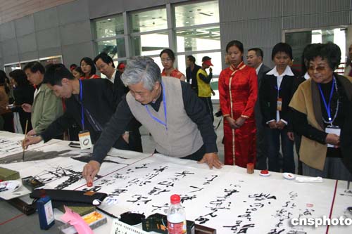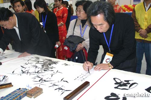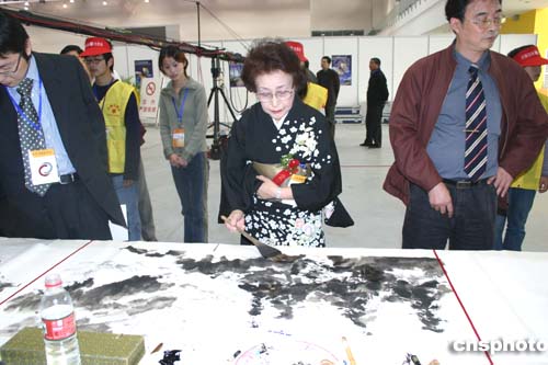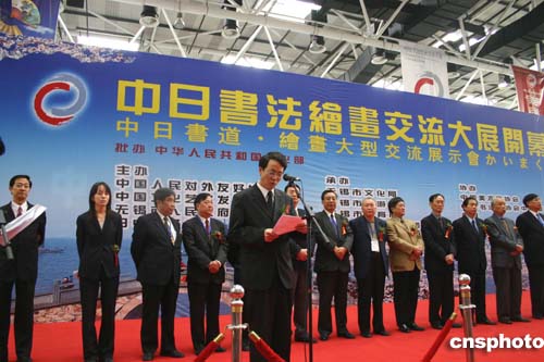 中新網(wǎng)11月6日電(記者邱觀史)為期三天的“中日書法繪畫交流大展”6日在美麗的太湖之濱江蘇無錫拉開帷幕。百名中日書畫家展示他們傾心裝做的200余幅作品,為觀眾獻上極富美感的視覺享受。中國文化部副部長?巳食鱿_幕式并發(fā)表講話。