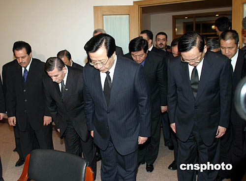 中新社北京十一月十一日電 (記者李靜)中國國家副主席曾慶紅十一日到巴勒斯坦國駐華使館,代表中國政府吊唁巴勒斯坦國總統(tǒng)、巴勒斯坦民族權(quán)力機(jī)構(gòu)主席亞西爾·阿拉法特逝世并敬獻(xiàn)花圈。國務(wù)委員唐家璇陪同前往吊唁。