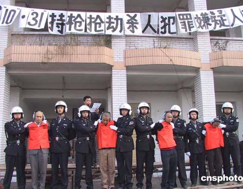 警方介紹,今天被公開(kāi)逮捕的四名犯罪嫌疑人中最小的只有十八歲,其中一人因涉嫌犯私藏槍支被逮捕,另外三人因涉嫌搶劫殺人被逮捕。