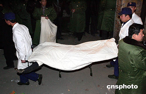 二零零四年十一月二十一日晚,經(jīng)過連續(xù)搜索搶救,河北省邢臺市沙河礦難死亡人數(shù)又有所增加,又有十多名礦工的遺體被抬出金鼎鐵礦巷口。中新社記者:武仲林