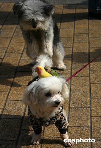 日本導(dǎo)盲犬電影《再見(jiàn)了,可魯》在臺(tái)灣上映首周,不僅票房突破三千萬(wàn)新臺(tái)幣,而且在臺(tái)灣島內(nèi)掀起一股“可魯熱”。圖為一只小狗在主人牽引下“馱”著兩只小鳥悠然漫步臺(tái)北街頭,還惹得一只貓咪湊近觀看。中新社記者:董會(huì)峰