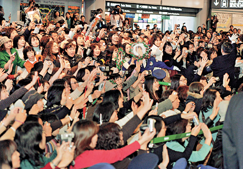 五千多名支持者帶著大束玫瑰和寫上歡迎字句的橫額,擠滿東京附近成田機場的入境大堂,一睹這名雄霸日本電視的三十二歲娃娃臉巨星。這些支持者大多是四十來歲的家庭婦女。