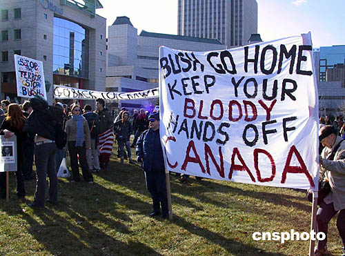 當(dāng)?shù)貢r間十一月三十日,抵達(dá)渥太華開始對加拿大進(jìn)行訪問的美國總統(tǒng)布什遭遇大規(guī)模抗議示威。示威者舉著“布什回家去,讓你沾滿鮮血的雙手遠(yuǎn)離加拿大”的橫幅,抗議布什的戰(zhàn)爭政策。作者:蒲力