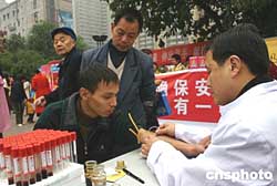 重慶市傳染病醫(yī)院的醫(yī)療人員上街免費(fèi)為市民抽血檢測(cè)HIV病毒。作者:郭晉嘉