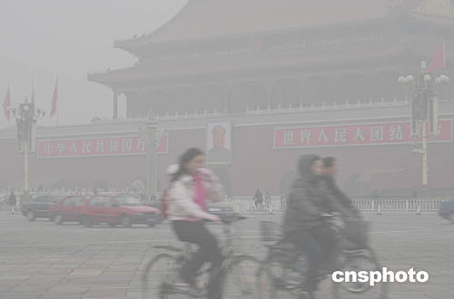 十二月二日清晨,北京天安門城樓和長安街籠罩在濃重的霧氣當中。北京連日來遭遇大霧天氣,首都機場眾多飛機航班延誤,京開、京沈、京津、京石等高速公路相繼關閉,城市道路能見度降低,交通事故明顯增多。中新社記者:毛建軍