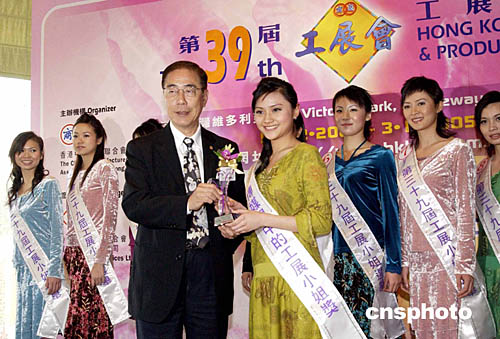 廠商聯(lián)合會會長楊孫西向率先出爐的“傳媒眼中的工展小姐”麥鍶銘頒獎。