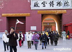 | 北京的六大世界文化遺產(chǎn)門(mén)票擬上漲的消息傳出后,打電話給各大旅行社咨詢(xún)報(bào)名北京游的各地民眾猛增。據(jù)國(guó)旅假期國(guó)內(nèi)旅游觀光分公司總經(jīng)理黃就明稱(chēng),目前推出的“北京雙飛團(tuán)五天豪華團(tuán)游”價(jià)格為一千四百三十八元人民幣,包括了游故宮、八達(dá)嶺長(zhǎng)城、天壇、頤和園、定陵五大景點(diǎn)。如門(mén)票總價(jià)格上調(diào)一百三十五元,團(tuán)費(fèi)也將隨之上升,升幅將近一成。圖為12月8日上午一隊(duì)游客剛從故宮出來(lái)。作者:張碩