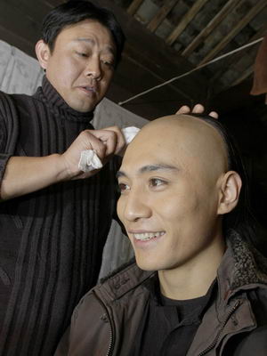 答:那是戴頭套的。這個戲是我第一次剃頭,因?yàn)橐成祥L辮子,不然就粘不穩(wěn)。