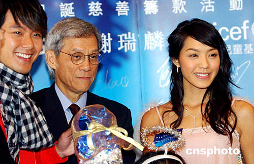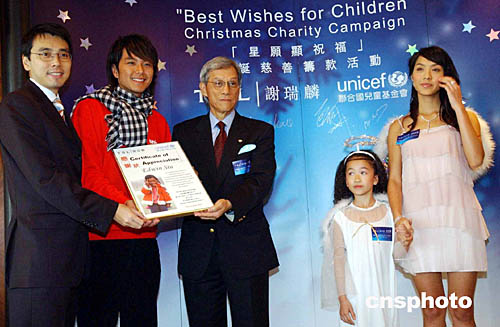 為《中國兒童周》教育項目籌募經(jīng)費。聯(lián)合國兒童基金會香港委員會主席馮慶彪、謝瑞麟執(zhí)行董事陳偉康[左]向明星蕭正楠頒贈感謝狀,感謝蕭正楠應(yīng)邀擔任親善之星。