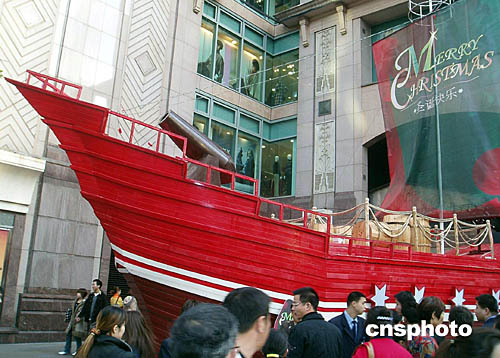 時(shí)下,上海圣誕氣氛濃,一艘巨型圣誕船新近亮相淮海路,吸引路人駐足觀賞。作者:潘索菲