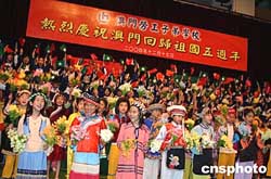 來自小學舞蹈組的五十六位同學,穿著五十六個少數(shù)民族的艷麗服裝,一一亮相,并表演了《歡聚澳門》歌舞劇。甫下飛機即趕來的潘曼霞不顧勞頓,高歌一曲《我愛你,中國》,贏得滿堂喝彩。