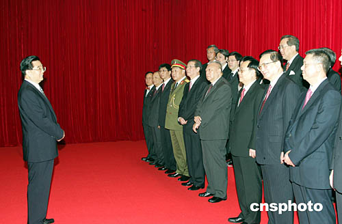 十二月二十日上午,胡錦濤在澳門文化中心會(huì)見(jiàn)香港特區(qū)政府官員,并在合影后發(fā)表講話。作者:宗金柱