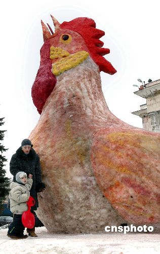 12月18日,在俄羅斯的里賓斯克,一只70噸重的雪雕大公雞在一公園亮相,迎接新年到來(lái)。Ic/cnsphoto