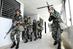 整個演習分為兩個階段進行。第一個階段是中級和高級軍官在指揮所里用電腦進行戰(zhàn)爭模擬,完全是虛擬世界的真實戰(zhàn)爭;第二個階段則是實兵演習,主要是演練特種部隊如何應對滲入后方的敵人。