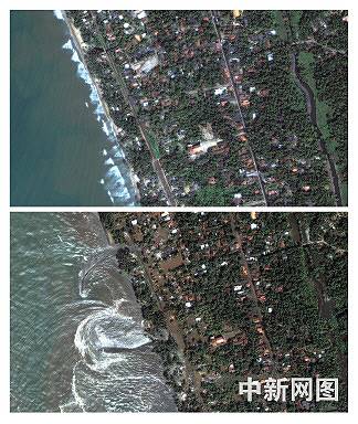 這張合成圖片來自2004年12月29日“電子全球”接收到的衛(wèi)星圖片。上方圖片攝于2004年1月1月,下方圖片則攝于當?shù)貢r間2004年12月26日上午10點20分。當時一場海嘯剛剛席卷了斯里蘭卡西南部卡魯塔拉市,翻卷的海水正在涌出海岸線外。