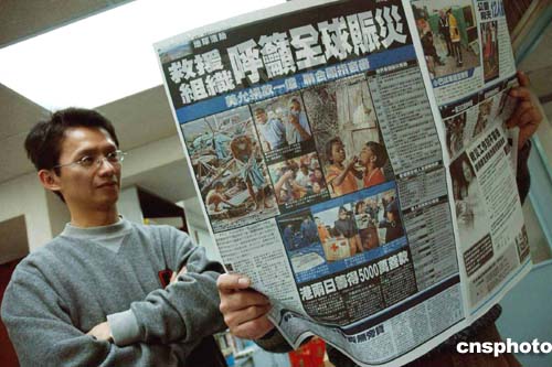 香港報刊報導(dǎo);南亞海嘯世紀大災(zāi)難首次傳來港人死訊,1名39歲香港男子證實在泰國布吉死亡,在這次災(zāi)難中,另有213港人失去聯(lián)絡(luò)。12月 29日上午,市民閱讀當(dāng)天新聞密切關(guān)注有關(guān)消息。作者:洪少葵
