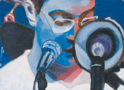 竇唯還特別喜歡用畫描繪自己樂隊(duì)演出時(shí)的景象,在昨日曝光的作品中就有兩幅。從畫面上看,一組搖滾樂隊(duì)正在舞臺(tái)上盡情揮灑激情,而臺(tái)下的觀眾也投入欣賞。另外一幅自畫像更是惹眼,藍(lán)色是畫的基調(diào),畫中的竇唯掩在兩只話筒后面,低頭正沉醉地低唱著。總的看來,竇唯的小畫未必惹眼但很精妙。不賣不展