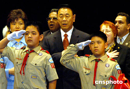 紐約州議長蕭華主持了孟廣瑞的就職儀式,孟廣瑞在夫人和兒女的陪伴下右手放在《圣經(jīng)》上,舉起左手,宣誓就職成為紐約州歷史上第一位華裔眾議員。