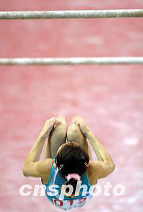 2004年5月15日,2004全國體操錦標(biāo)賽暨奧運(yùn)會(huì)預(yù)選賽的女子資格賽在江蘇省蘇州市體育中心體育館舉行,來自全國19個(gè)省市的代表隊(duì)參加了此次比賽。圖為女子高低杠比賽。中新社記者:盛佳鵬