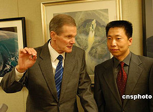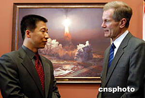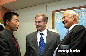 中國(guó)首位進(jìn)入太空飛行的宇航員楊利偉今天下午在華盛頓會(huì)晤美國(guó)上世紀(jì)八十年代的宇航員、現(xiàn)在的國(guó)會(huì)參議員比爾·納爾遜。