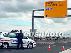 圖:法國警方當(dāng)天封鎖通往出事候機(jī)廳的通道