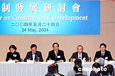 香港政制發(fā)展專責(zé)小組委托中央政組,于5月24日在會(huì)展中心舉辦首場(chǎng)政制發(fā)展研討會(huì),主題為專責(zé)小組發(fā)表的第三號(hào)報(bào)告書中,有關(guān)2007年行政長(zhǎng)官及2008年立法會(huì)產(chǎn)生辦法可考慮修改地方。 地方。作者:洪少葵