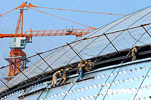 五月二十四日,建筑安裝工人正在國(guó)家大劇院殼體穹頂施工。國(guó)家大劇院橢圓形殼體穹頂自四月一日開(kāi)始安裝鈦金屬板以來(lái),工程進(jìn)展順利,預(yù)計(jì)六月底完成。中國(guó)國(guó)家大劇院由法國(guó)設(shè)計(jì)師保羅·安德魯設(shè)計(jì)。中新社記者:張煒