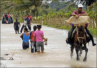 中新網(wǎng)5月26日電 多米尼加西部發(fā)生洪水。圖為人們?cè)诒缓樗蜎](méi)的道路上行走。(固山)