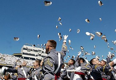 經(jīng)過數(shù)年的苦讀與磨煉之后,美國著名的西點(diǎn)軍校的畢業(yè)生終于“解放了”。圖為2004級畢業(yè)生在參加完他們的畢業(yè)典禮之后,紛紛將畢業(yè)帽甩向半空中,慶祝他們走出校門,踏上未來的“將軍之路”。