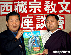 美東時(shí)間五月三十一日,正在紐約訪問的中國藏學(xué)家、活佛代表團(tuán)參加紐約亞美文化協(xié)會主辦的“西藏宗教文化座談會”。中央民族大學(xué)副校長喜饒尼瑪(右)向亞美文化協(xié)會會長黃哲操(左)贈送手繪唐卡、史詩《格薩爾》唐卡圖冊等禮物。作者:趙海燕