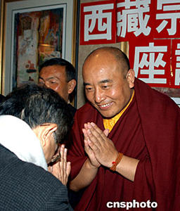 美東時(shí)間五月三十一日,正在紐約訪問的西藏自治區(qū)日喀則布都寺活佛土旦次旺(左一)和四川省德格縣竹慶寺活佛多吉扎西(右一)向僑胞敬獻(xiàn)哈達(dá)。作者:趙海燕