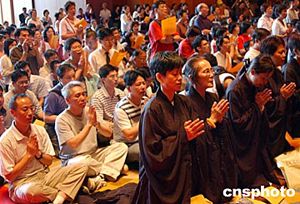 閉幕典禮前,香港佛教界還舉辦了隆重莊嚴(yán)的“圓滿傳供”禮佛儀式。約四千名佛教徒身著法衣,跪拜佛前,在悠揚(yáng)的念佛聲中,依序?qū)ⅰ跋恪、“花”、“燈”、“果”、“荼”、“食”等供品傳遞到供奉著佛指舍利和三寶佛的禮臺(tái)上,以感念佛陀恩澤,并表達(dá)對(duì)佛陀的最高敬意。整個(gè)儀式長(zhǎng)達(dá)兩個(gè)多小時(shí)。