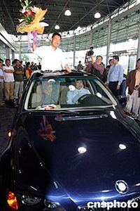 隨著陜西西安“體育彩票造假案”全案告破,六月四日下午,陜西省西安市體彩中心負責人宣布劉亮于三月二十三日所獲特等A獎彩票有效,并向其當面交付所中得的寶馬轎車。同時,陜西省、西安市體育局負責人向劉亮公開道歉。圖為劉亮喜獲寶馬車后的情形。作者:李宗文