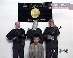 20日晚,阿拉伯“半島”電視臺播放了一段錄影帶,畫面上的武裝份子稱,除非韓國保證在24小時內停止派兵赴伊拉克,否則他們將把一名韓國人質斬首。綁架人質的武裝分子自稱屬于“團結圣戰(zhàn)組織”。該組織曾多次通過電子郵件向半島電視臺發(fā)送綁架人質的錄像片段,或在其網站上聲稱對某一襲擊事件負責。據(jù)稱,該組織由恐怖頭目扎卡維領導,與“基地”組織有聯(lián)系。