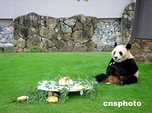 中國(guó)第二只“海歸”大熊貓“雄浜”六月二十一日將離開(kāi)日本回到中國(guó),在即將離別之際,日本白浜野生動(dòng)物園特別為“雄浜”準(zhǔn)備了由竹子、香蕉、蘋(píng)果組成的一個(gè)特大“水果蛋糕”。圖為“雄浜”草坪上盡情享受在日本最后一頓晚餐。作者:肖龍聯(lián)