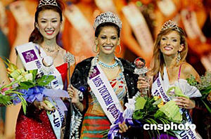 6月29日,令人矚目的2004國際旅游小姐冠軍總決賽在浙江杭州落下帷幕。印度選手ZABINA ABDUL RASHID KHAN,(中)從來自51個國家的53位旅游形象大使中脫穎而出獲得冠軍。德國選手JOHNALENA KWASOW獲得亞軍,中國選手鈔俊男(左)也發(fā)揮了較好的水平,在強手如林的競爭中獲得第三名。作者:饒強