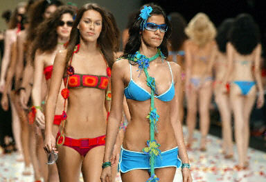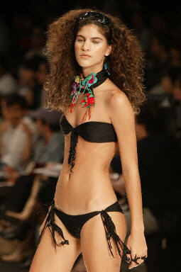 6月30日,里約熱內(nèi)盧時(shí)裝周上模特展示設(shè)計(jì)師Miquelina設(shè)計(jì)的比基尼。