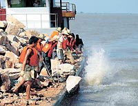 新華社的圖片報道顯示,施工人員近日在武漢江段武青干堤施工現(xiàn)場向水中拋石。