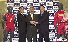 日本體育用品代表企業(yè)美津濃7月6日在東京展示贊助中國女排(圖左)與中國女壘(圖右)參加雅典奧運的比賽用服,并宣布將在北京奧運會之前的四年內(nèi)加大投資中國的力度,爭取占得更大市場份額。作者:王健