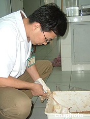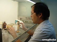 七月七日,武漢同濟醫(yī)院宣布:該院的科研專家研究發(fā)現(xiàn)一種能“激活”胰島素受體下游信號,增加胰島素敏感的基因能治療糠尿病。圖為研究人員在實驗室調(diào)試基因培養(yǎng)液。作者:艾啟平