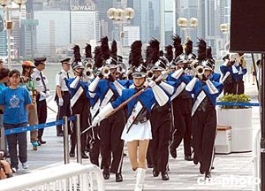 步操團(tuán)奏樂表演為記者會(huì)助聲勢(shì)。歌影紅星劉德華7月8日在香港尖沙咀星光大道舉行《道地百果園劉德華Vision Tour演唱會(huì)2004》記者會(huì),大會(huì)特意安排步操團(tuán)奏樂表演,為記者會(huì)助聲勢(shì)。作者:鄧慶樂