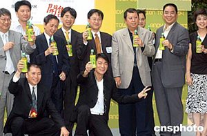 歌影紅星劉德華7月8日在香港尖沙咀星光大道舉行《道地百果園劉德華Vision Tour演唱會(huì)2004》記者會(huì),劉德華與演唱會(huì)主辦機(jī)構(gòu)高層、贊助商及各大傳媒嘉賓會(huì)上以綠茶代酒預(yù)祝演唱會(huì)舉辦成功。作者:鄧慶樂