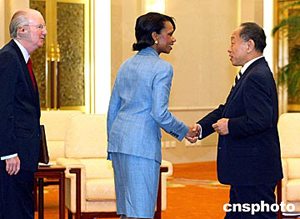 七月九日,繼續(xù)在北京訪問的美國總統(tǒng)國家安全事務(wù)助理賴斯與中國外交部部長李肇星互致問候,賴斯將于當(dāng)天中午離開北京赴漢城繼續(xù)她的亞洲之行。中新社記者:鄭萍萍