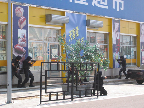 在模擬街區(qū)破襲劫案中,場內(nèi)觀摩人士皆有身臨其境之感。三名蒙面持槍和爆炸物的“歹徒”從黑色小轎車魚貫跳下,闖入銀行內(nèi)進(jìn)行搶劫,隨著一聲槍響,模擬街區(qū)銀行搶劫案發(fā),民眾慌亂撤離,“歹徒”搶劫得逞后駕車逃離現(xiàn)場。特警隊(duì)員接到報(bào)警后迅速趕到現(xiàn)場。最先趕到的步巡小組和陸續(xù)到達(dá)的巡邏車組相互配合,開展堵截。犯罪嫌疑人開槍拒捕,逃到一家商店內(nèi)繼續(xù)與警方對(duì)抗。警方包圍商店后,特警采取各種單兵和小組戰(zhàn)術(shù)接近商店,選擇時(shí)機(jī)向屋內(nèi)投擲爆震彈并迅速出擊,同時(shí)抓獲犯罪嫌疑人。