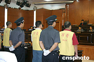“一二·二三”特大井噴事故案今天上午九時(shí)三十分在重慶市第二中級(jí)人民法院開(kāi)庭審理。圖為審判庭內(nèi)被告人在接受問(wèn)訊。作者:鄒輝