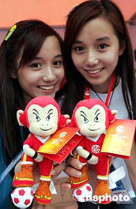 二零零四年亞洲杯足球賽七月十七日晚在北京工人體育場開幕,開幕式前,一對在北京廣播學(xué)院就讀的雙胞胎姐妹在場外推銷可愛的吉祥物猴子“貝貝”。中新社記者:毛建軍