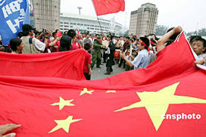 七月十七日,中國球迷在亞洲杯足球賽開幕式會(huì)場外吶喊,為亞洲杯首度在中國舉辦而喝彩。二零零四年亞洲杯足球賽當(dāng)晚在北京開幕。中新社記者:毛建軍