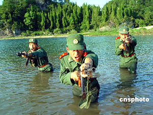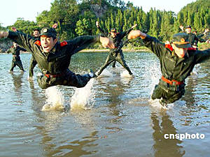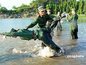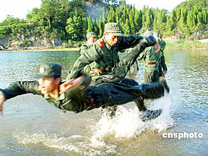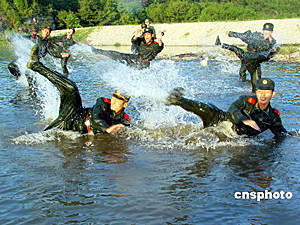 7月18日,浙江省仙居縣武警官兵頂著烈日,冒著酷暑進行水上高難項目訓練。為適應水上戰(zhàn)斗能力,仙居縣武警官兵頂著烈日,開始進行為期15天的水上訓練。華文武 攝