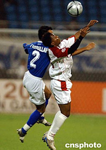 7月19日晚,2004年亞洲杯B組科威特隊與阿聯(lián)酋隊的比賽在濟(jì)南山東省體育中心開戰(zhàn)?仆仃(藍(lán))發(fā)揮出色,最終以3比1大勝阿聯(lián)酋隊。中新社記者:武仲林