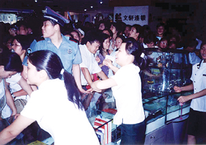 下午2時(shí),當(dāng)記者趕赴現(xiàn)場(chǎng)時(shí),書(shū)城門(mén)口的廣場(chǎng)已經(jīng)被少男少女們“霸占”得幾無(wú)落腳之處。書(shū)城因此停止了營(yíng)業(yè),禁止人員隨意出入;在近百名保安和工作人員的強(qiáng)力控制下,歌迷們被分批放進(jìn)簽售內(nèi)場(chǎng),每次只放進(jìn)五六個(gè)人。大量無(wú)法入內(nèi)的歌迷因此不得不擁擠在書(shū)城門(mén)口內(nèi)外,無(wú)法前進(jìn),也無(wú)法抽身后退。書(shū)城幾乎把所有的保安和工作人員都調(diào)集到現(xiàn)場(chǎng)來(lái)維持秩序,在林俊杰和歌迷群之間形成了一道人墻。